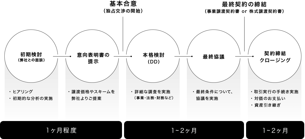 M&A後もスムーズな統合と安心を最優先に、事前の計画から実行・定着まで伴走いたします。お客様の文化や体制を尊重しながら、負担を最小限に抑え、不安なく次のステージへ進める環境づくりを徹底します。※上記の流れは一例であり、実際の期間と異なる場合がございます。